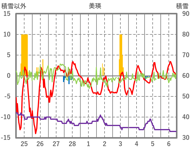 | 日 | 時 | 気温 | 降水 | 風向/風速 | 日照 | 積雪 | 降雪 |
