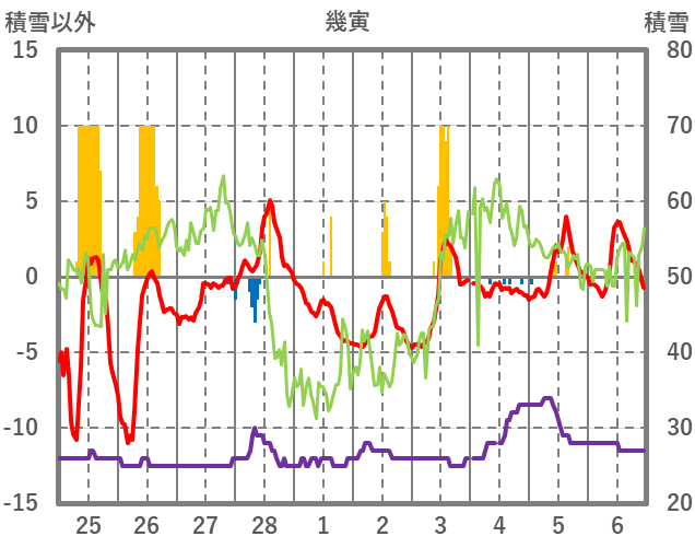 | 日 | 時 | 気温 | 降水 | 風向/風速 | 日照 | 積雪 | 降雪 |