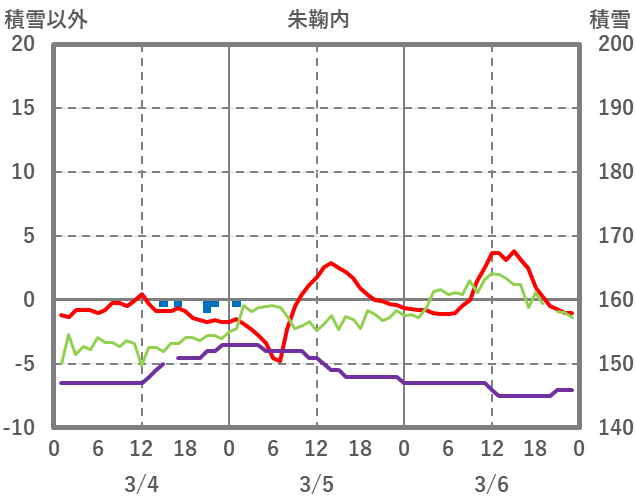 | 日 | 時 | 気温 | 降水 | 風向/風速 | 日照 | 積雪 | 降雪 |