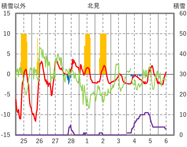 | 日 | 時 | 気温 | 降水 | 風向/風速 | 日照 | 積雪 | 降雪 |