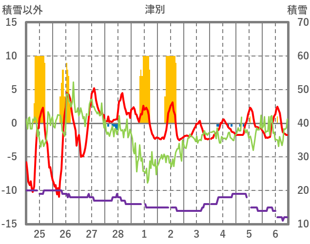 | 日 | 時 | 気温 | 降水 | 風向/風速 | 日照 | 積雪 | 降雪 |