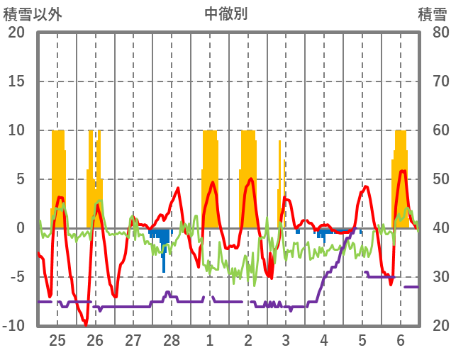 | 日 | 時 | 気温 | 降水 | 風向/風速 | 日照 | 積雪 | 降雪 |
