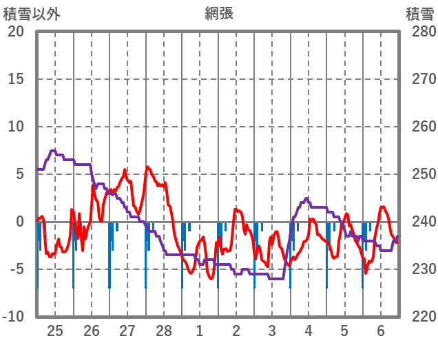 | 日 | 時 | 気温 | 降水 | 風向/風速 | 日照 | 積雪 | 降雪 |