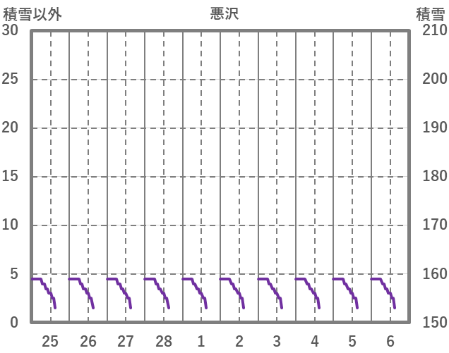 | 日 | 時 | 気温 | 降水 | 風向/風速 | 日照 | 積雪 | 降雪 |