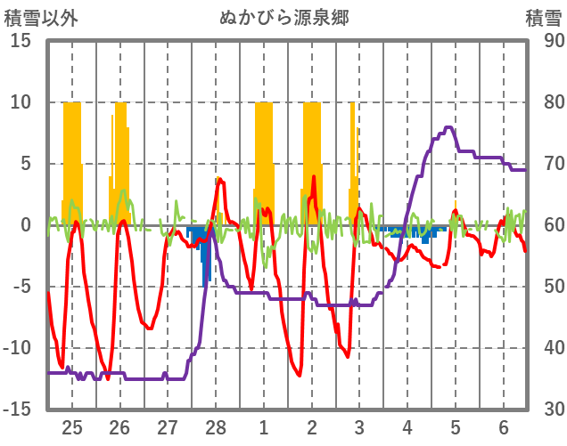 | 日 | 時 | 気温 | 降水 | 風向/風速 | 日照 | 積雪 | 降雪 |