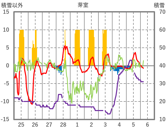 | 日 | 時 | 気温 | 降水 | 風向/風速 | 日照 | 積雪 | 降雪 |