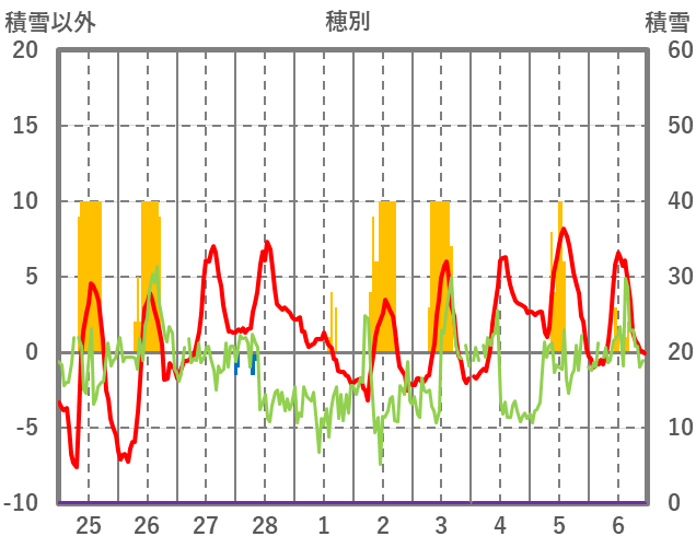 | 日 | 時 | 気温 | 降水 | 風向/風速 | 日照 | 積雪 | 降雪 |