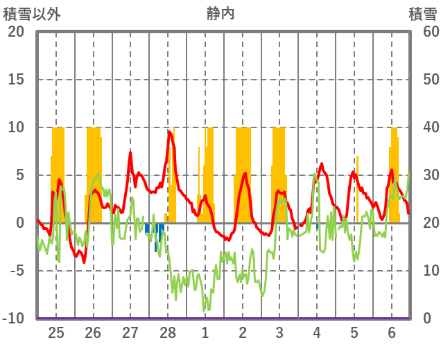 | 日 | 時 | 気温 | 降水 | 風向/風速 | 日照 | 積雪 | 降雪 |