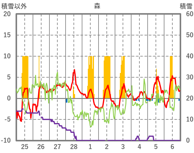 | 日 | 時 | 気温 | 降水 | 風向/風速 | 日照 | 積雪 | 降雪 |