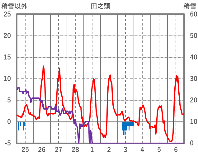| 日 | 時 | 気温 | 降水 | 風向/風速 | 日照 | 積雪 | 降雪 |