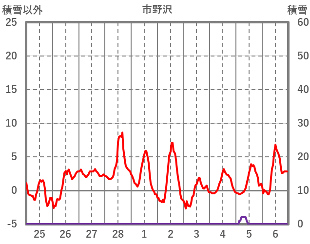| 日 | 時 | 気温 | 降水 | 風向/風速 | 日照 | 積雪 | 降雪 |
