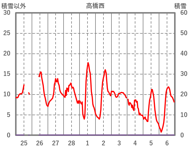 | 日 | 時 | 気温 | 降水 | 風向/風速 | 日照 | 積雪 | 降雪 |