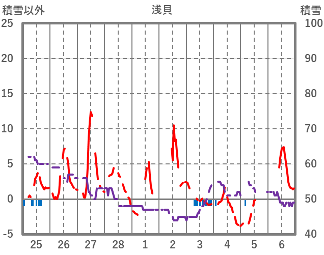 | 日 | 時 | 気温 | 降水 | 風向/風速 | 日照 | 積雪 | 降雪 |