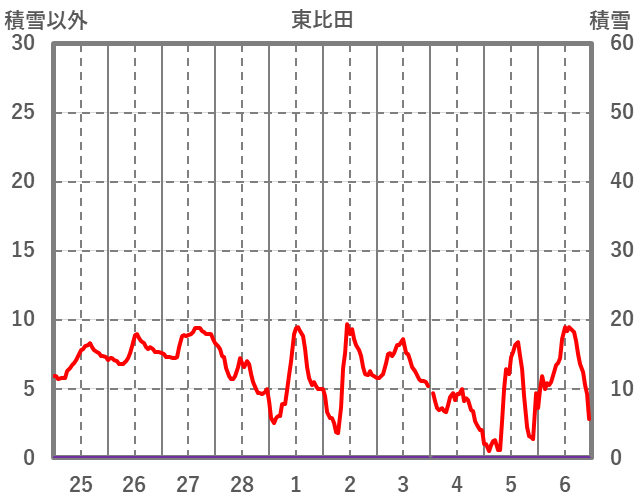| 日 | 時 | 気温 | 降水 | 風向/風速 | 日照 | 積雪 | 降雪 |