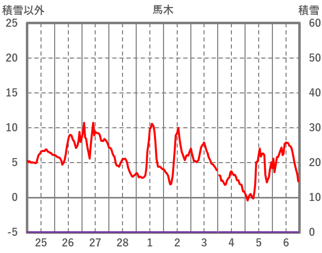 | 日 | 時 | 気温 | 降水 | 風向/風速 | 日照 | 積雪 | 降雪 |