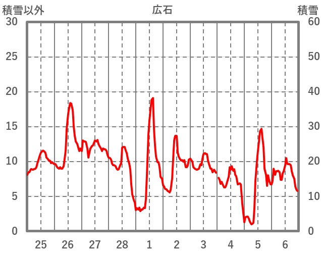 | 日 | 時 | 気温 | 降水 | 風向/風速 | 日照 | 積雪 | 降雪 |