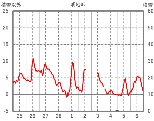 | 日 | 時 | 気温 | 降水 | 風向/風速 | 日照 | 積雪 | 降雪 |