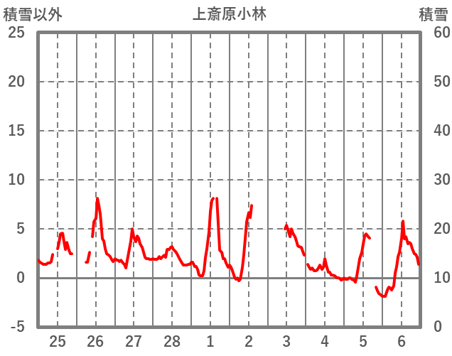 | 日 | 時 | 気温 | 降水 | 風向/風速 | 日照 | 積雪 | 降雪 |