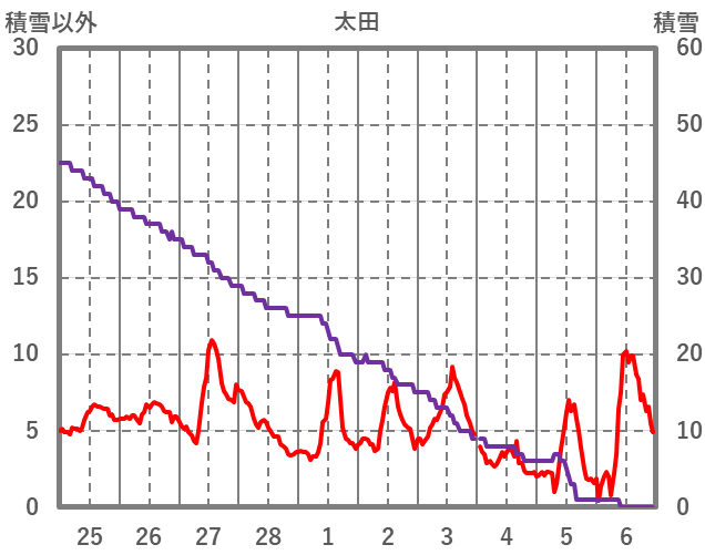 | 日 | 時 | 気温 | 降水 | 風向/風速 | 日照 | 積雪 | 降雪 |