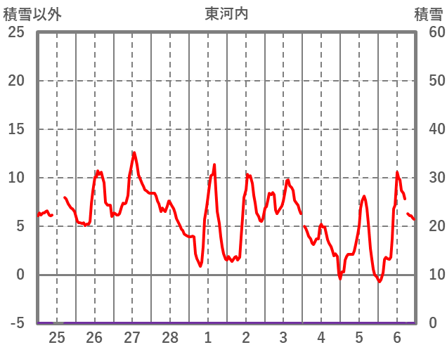 | 日 | 時 | 気温 | 降水 | 風向/風速 | 日照 | 積雪 | 降雪 |
