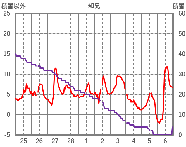 | 日 | 時 | 気温 | 降水 | 風向/風速 | 日照 | 積雪 | 降雪 |
