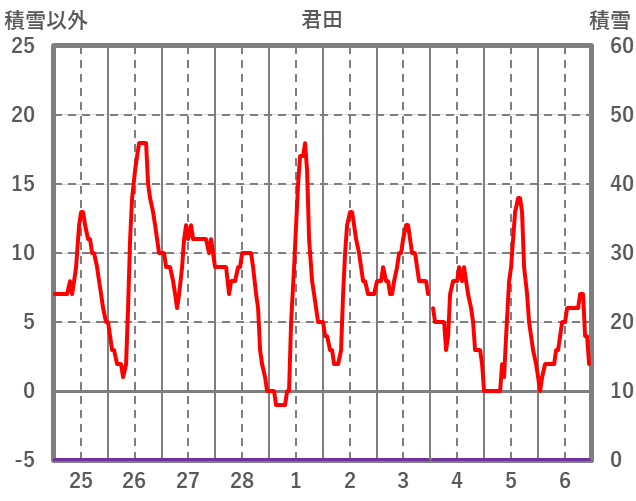 | 日 | 時 | 気温 | 降水 | 風向/風速 | 日照 | 積雪 | 降雪 |