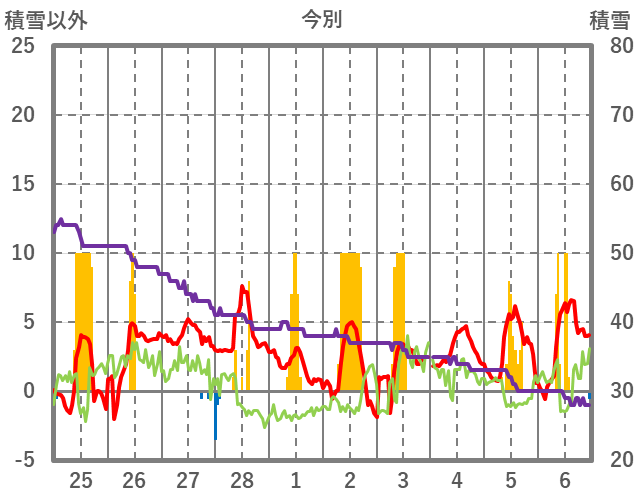 | 日 | 時 | 気温 | 降水 | 風向/風速 | 日照 | 積雪 | 降雪 |