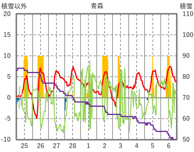 | 日 | 時 | 気温 | 降水 | 風向/風速 | 日照 | 積雪 | 降雪 |