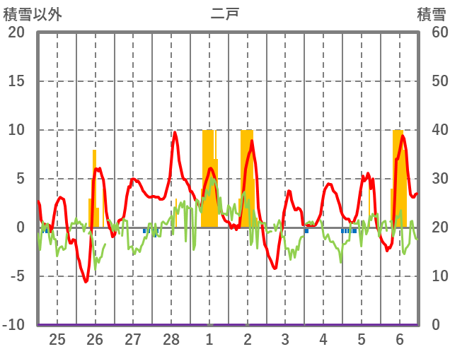 | 日 | 時 | 気温 | 降水 | 風向/風速 | 日照 | 積雪 | 降雪 |