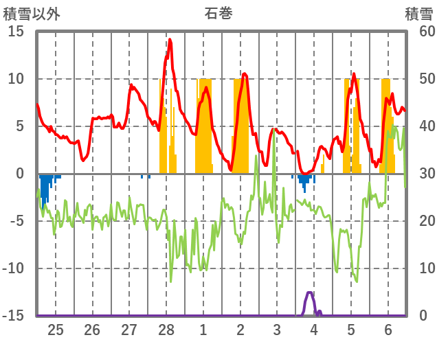 | 日 | 時 | 気温 | 降水 | 風向/風速 | 日照 | 積雪 | 降雪 |