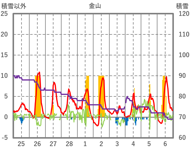 | 日 | 時 | 気温 | 降水 | 風向/風速 | 日照 | 積雪 | 降雪 |