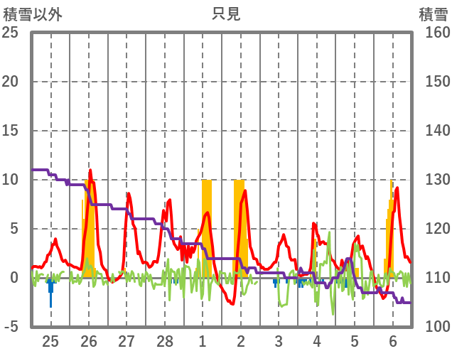 | 日 | 時 | 気温 | 降水 | 風向/風速 | 日照 | 積雪 | 降雪 |