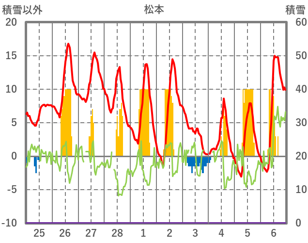 | 日 | 時 | 気温 | 降水 | 風向/風速 | 日照 | 積雪 | 降雪 |