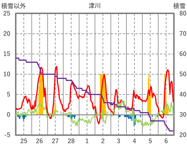 | 日 | 時 | 気温 | 降水 | 風向/風速 | 日照 | 積雪 | 降雪 |