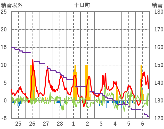 | 日 | 時 | 気温 | 降水 | 風向/風速 | 日照 | 積雪 | 降雪 |