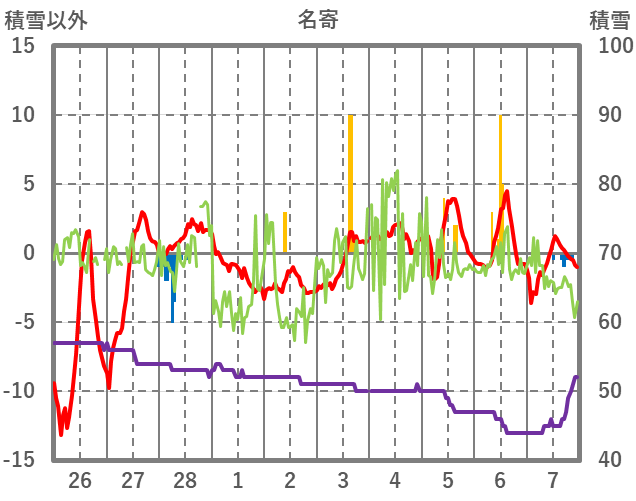 | 日 | 時 | 気温 | 降水 | 風向/風速 | 日照 | 積雪 | 降雪 |