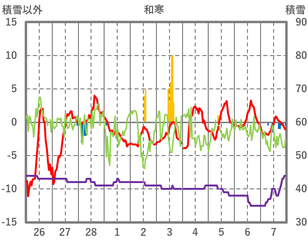| 日 | 時 | 気温 | 降水 | 風向/風速 | 日照 | 積雪 | 降雪 |