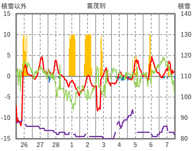 | 日 | 時 | 気温 | 降水 | 風向/風速 | 日照 | 積雪 | 降雪 |