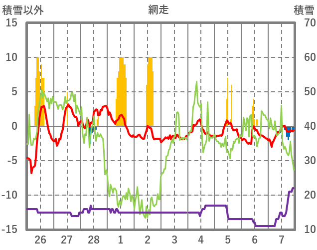 | 日 | 時 | 気温 | 降水 | 風向/風速 | 日照 | 積雪 | 降雪 |