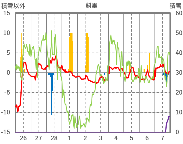 | 日 | 時 | 気温 | 降水 | 風向/風速 | 日照 | 積雪 | 降雪 |