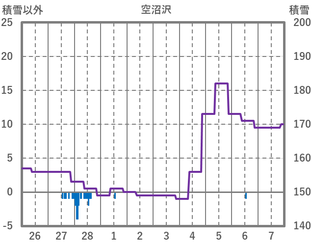 | 日 | 時 | 気温 | 降水 | 風向/風速 | 日照 | 積雪 | 降雪 |