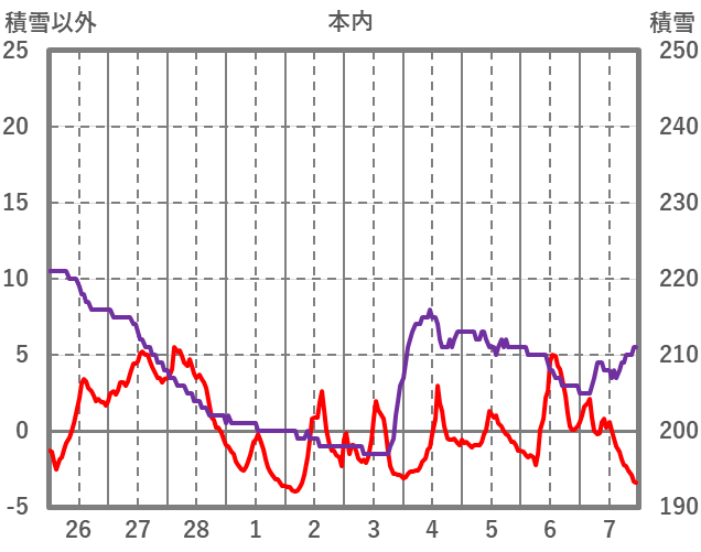 | 日 | 時 | 気温 | 降水 | 風向/風速 | 日照 | 積雪 | 降雪 |