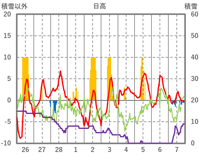 | 日 | 時 | 気温 | 降水 | 風向/風速 | 日照 | 積雪 | 降雪 |
