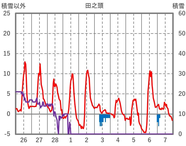 | 日 | 時 | 気温 | 降水 | 風向/風速 | 日照 | 積雪 | 降雪 |