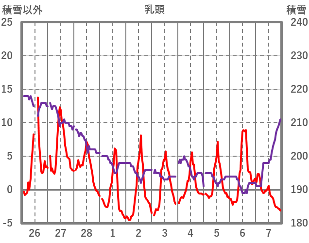 | 日 | 時 | 気温 | 降水 | 風向/風速 | 日照 | 積雪 | 降雪 |