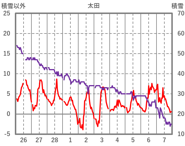 | 日 | 時 | 気温 | 降水 | 風向/風速 | 日照 | 積雪 | 降雪 |