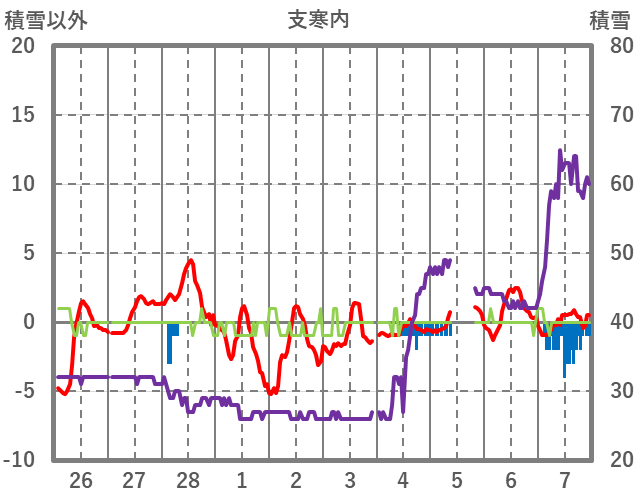 | 日 | 時 | 気温 | 降水 | 風向/風速 | 日照 | 積雪 | 降雪 |