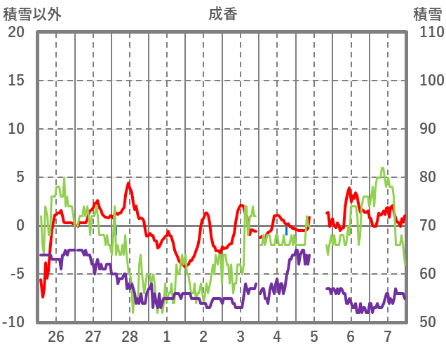 | 日 | 時 | 気温 | 降水 | 風向/風速 | 日照 | 積雪 | 降雪 |