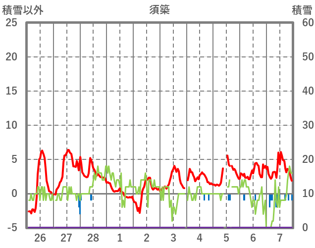| 日 | 時 | 気温 | 降水 | 風向/風速 | 日照 | 積雪 | 降雪 |