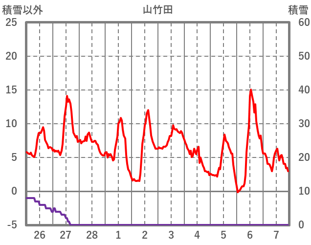 | 日 | 時 | 気温 | 降水 | 風向/風速 | 日照 | 積雪 | 降雪 |
